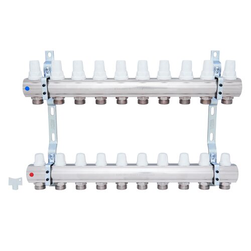 Колектор ICMA Арт. K005 з запірними кранами з мікрометричним регулюванням призначений для розподілу теплової енергії в системі опалення. Дана установка застосовується в системах радіаторного опалення. Регулювання витрати мережної води по контурах - ручна або терморегулююча. Запірні крани з мікрометричним регулюванням дозволяють перекривати подачу води і регулювати витрату мережної води в кожному контурі опалення. Колектор має 10 виходів.
