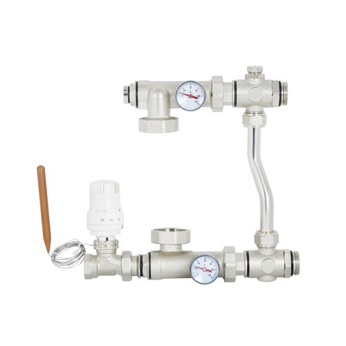 Змішувальна група SD Forte 1'' з байпасом призначена для установки в системі «Тепла підлога» на колекторі. Змішувальна група виконує функцію регулювання температури теплоносія в контурах системи. У комплектацію виробу входять: термоклапан, байпас, термоголовка білого кольору з занурювальним датчиком, коннектори (з термометрами) для під'єднання насоса циркуляційного, балансувальний клапан ручного регулювання, автоматичний і зливний кран.