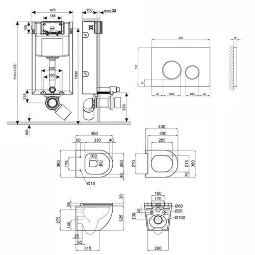 Габарити виробів (ВхШхД), мм | Унітаз: 325х360х490. Сидіння: 35х360х430. Інсталяція: 1280х425х235. Панель змиву: 150х220х12. |