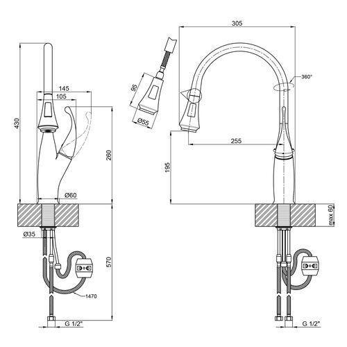 Додаткові характеристики | Довжина висувного шланга - 1470 мм. Довжина гнучкого підводу - 570 мм. |