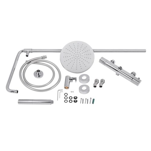 Комплектація Змішувач, кронштейн для верхнього душу, лійка для верхнього душу, кронштейн для ручного душу, лійка для ручного душу, душовий шланг, душова стійка, кріпильні деталі.