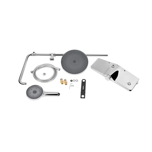 Комплектація | Змішувач, кронштейн для верхнього душу, лійка для верхнього душу, кронштейн для ручного душу, лійка для ручного душу, душовий шланг, душова стійка, кріпильні деталі. |
