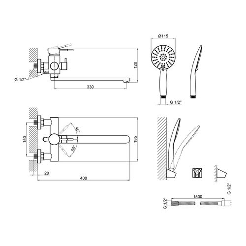 Комплектація Змішувач, лійка для ручного душу, душовий шланг, кронштейн для ручного душу, кріплення.
