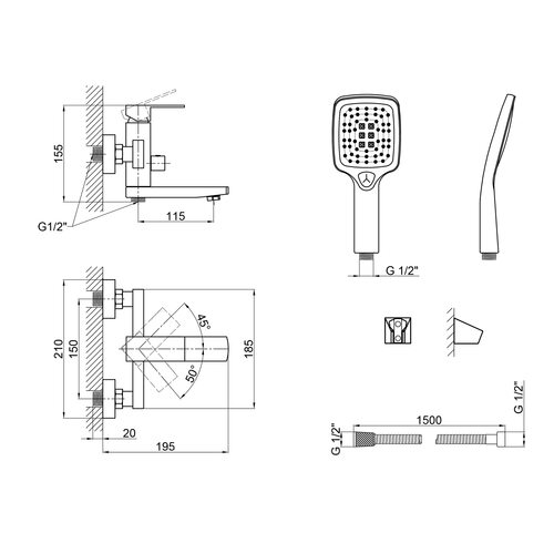 Комплектація | Змішувач, лійка для ручного душу, душовий шланг, кронштейн для ручного душу, кріплення. |
