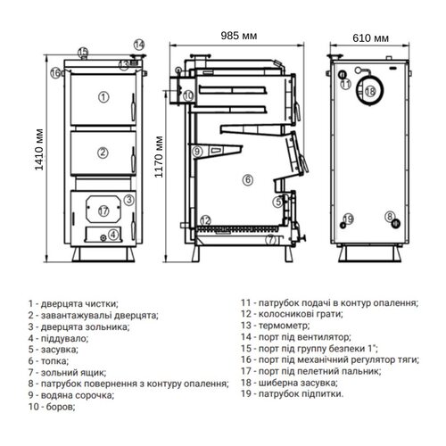 Габаритні розміри котла (ВхШхГ), мм 1410х610х985