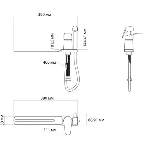 Комплектація | Змішувач, душовий шланг, воронка для гігієнічного душу, рейка, кріплення |