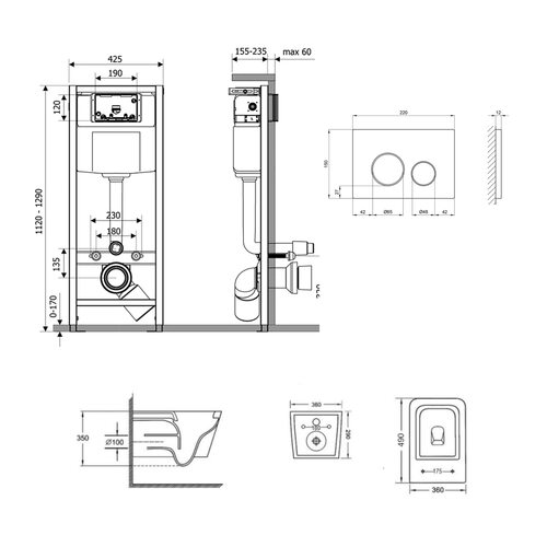 Габаритні розміри виробу (ШхГхВ), мм | Унітаз: 350х360х520. Сидіння для унітазу: 50х350х445. Інсталяція: 1280х425х185. Панель змиву: 150х220х30. |