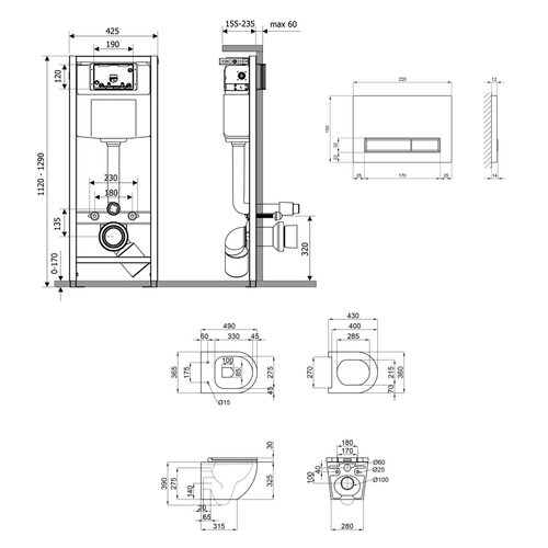 Габаритні розміри виробу (ШхГхВ), мм | Унітаз: 390х365х490. Сидіння для унітазу: 30х360х430. Інсталяція: 1280х425х185. Панель змиву: 150х220х32. |