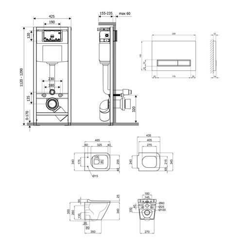 Габаритні розміри виробу (ШхГхВ), мм | Унітаз: 355х340х485. Сидіння для унітазу: 55х345х435. Інсталяція: 1280х425х185. Панель змиву: 150х220х32. |