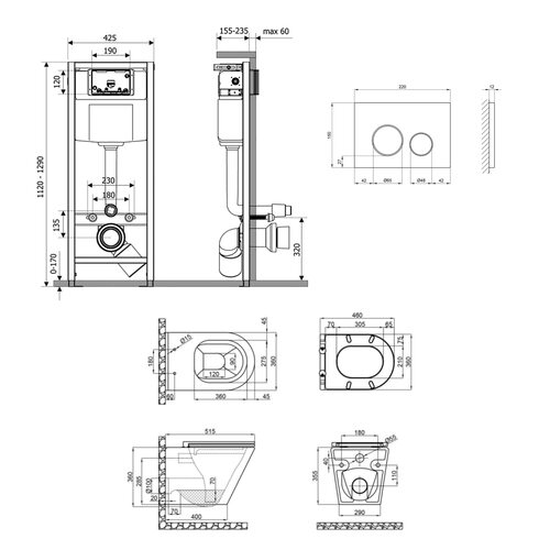 Габаритні розміри виробу (ШхГхВ), мм | Унітаз: 355х340х485. Сидіння для унітазу: 55х345х435. Інсталяція: 1280х425х185. Панель змиву: 150х220х30. |