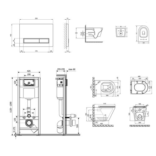 Габаритні розміри виробу (ШхГхВ), мм | Унітаз Jay: 350х360х520. Сидіння для унітазу: 35х367х455. Унітаз Scorpio: 360х360х515. Сидіння для унітазу: 30х360х460. Інсталяція: 1280х425х185. Панель змиву: 150х220х13. |