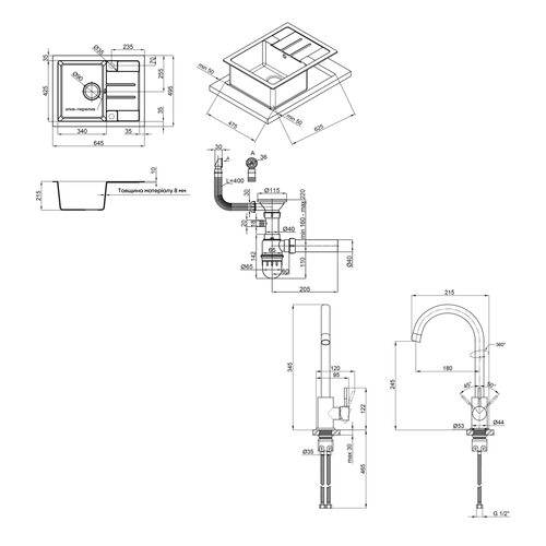 Матеріал | Штучний камінь – мийка, : нержавіюча сталь – змішувач |