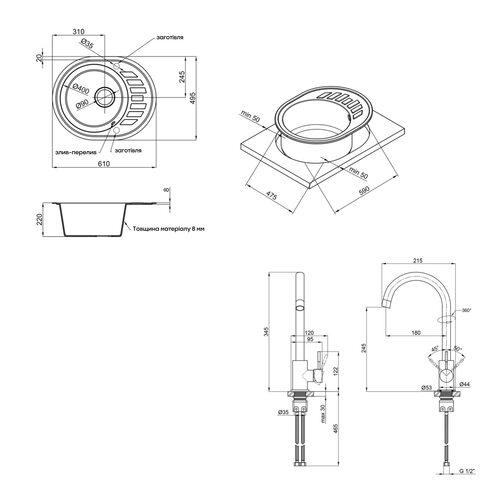 Матеріал | Штучний камінь – мийка, : нержавіюча сталь – змішувач |