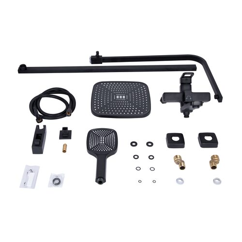 Комплектація Змішувач, кронштейн для верхнього душу, лійка для верхнього душу, кронштейн для ручного душу, лійка для ручного душу, душовий шланг, душова стійка, кріплення.