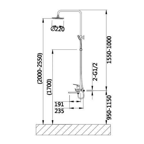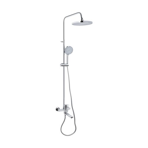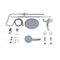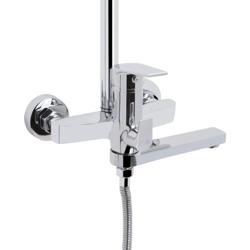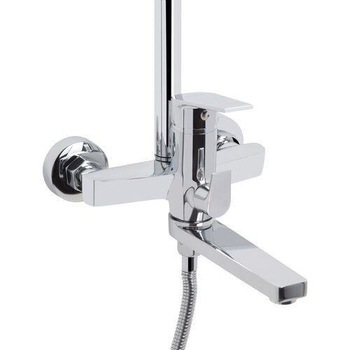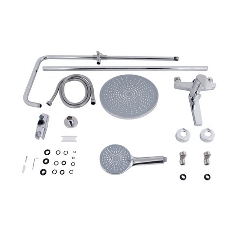 Комплектація | Змішувач, кронштейн для верхнього душу, лійка для верхнього душу, кронштейн для ручного душу, лійка для ручного душу, душовий шланг, душова стійка, деталі для кріплення. |
