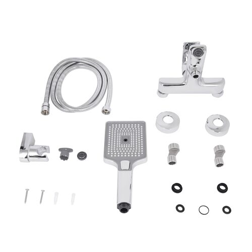 | Комплектація | Настінний змішувач, ручна лійка, душовий шланг, тримач для лійки, монтажні ексцентрики з декоративними накладками, ущільнювальні кільця, кріплення та монтажний набір (гвинти й дюбелі). |