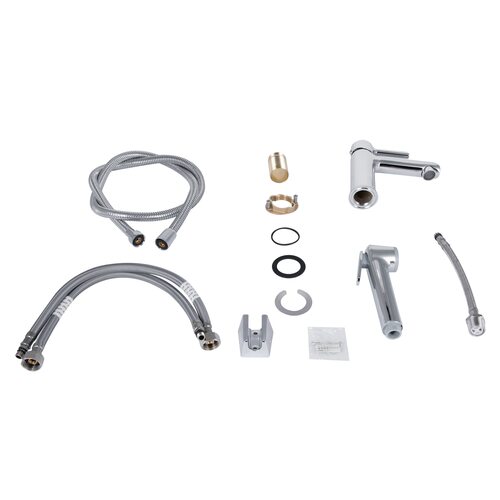 Комплектація | Змішувач, гнучкі підводки, гігієнічний душ, тримач для душу, елементи кріплення. |