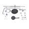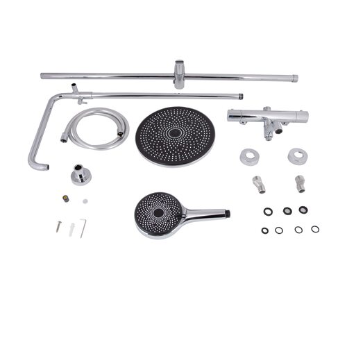 Комплектація | Змішувач, кронштейн для верхнього душу, лійка для верхнього душу, кронштейн для ручного душу, лійка для ручного душу, душовий шланг, душова стійка, деталі кріплення. |