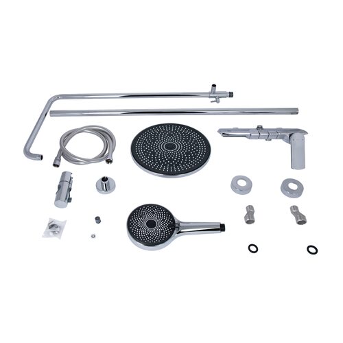Комплектація | Змішувач, кронштейн для верхнього душу, лійка для верхнього душу, кронштейн для ручного душу, лійка для ручного душу, душовий шланг, душова стійка, деталі кріплення. |