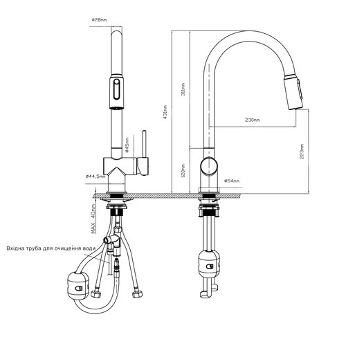 Комплектація | Змішувач, шланги підключення, шланг під фільтровану воду, деталі кріплення. |