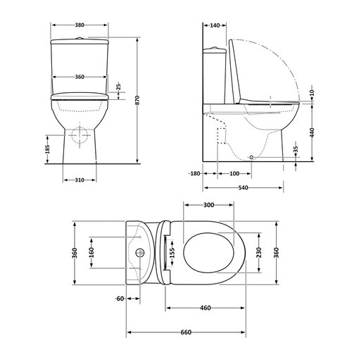 Зверніть увагу Нами докладено всіх зусиль для подання точної і правдивої інформації в описі унітазу. Основні розміри відповідають зазначеним на кресленні, а граничні відхилення від розмірів можуть змінюватись у межах ±2%, що так само, як і певні нерівності поверхні, пов'язані з технологією сушіння. Технологічний отвір зі зворотного боку унітазу може бути підрізаний для зручності монтажу - нижня перемичка потрібна тільки на період виробництва виробу. Для експлуатації вона не потрібна.