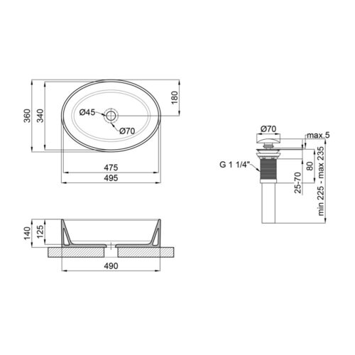 Габаритні розміри виробу (ШхГхВ), мм | 505x360x140 - раковина; 70х70х225 - донный клапан |