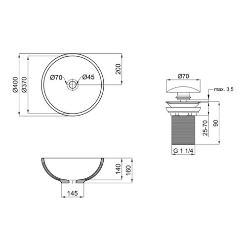 Габаритні розміри виробу (ШхГхВ), мм | 400х400х155 - раковина; 70х70х225 - донный клапан |