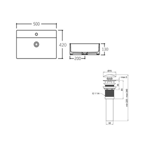 Габаритні розміри виробу (ШхГхВ), мм | 500х420х130 - раковина; 70х70х225 - донный клапан |