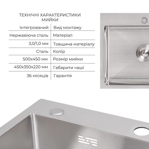 Матеріал Нержавіюча сталь - мийка; латунь / пластик - дозатор; нержавіюча сталь / пластик - кошик