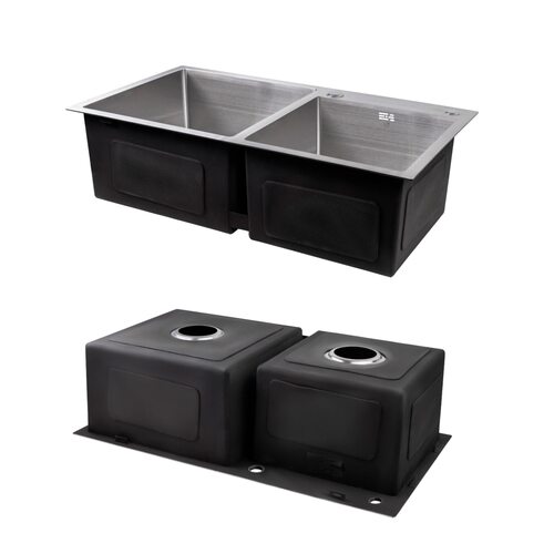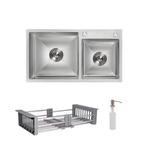 Комплект Lidz Handmade H7843 Мийка для кухні з двома чашами інтегрована Brushed у комплекті з дозатором + Lidz K01G Корзина для кухонної мийки