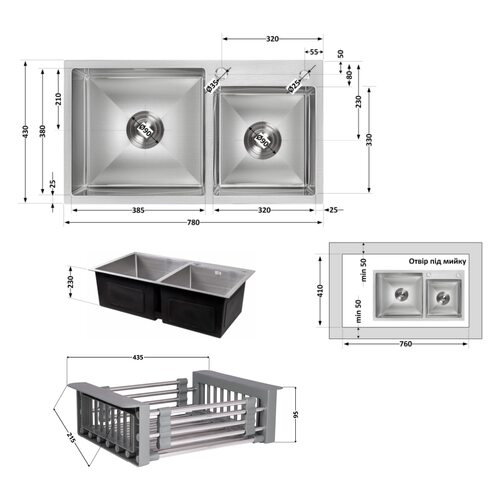Матеріал Нержавіюча сталь - мийка; нержавіюча сталь / пластик - кошик