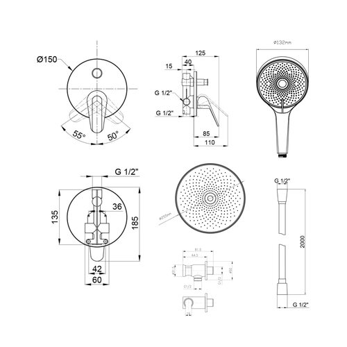 Вага брутто, кг | 1,65 - змішувач; 0,6 - лійка для ручного душу; 1,7 - лійка для верхнього душу; 0,425 - шланг; 0,3 - підключення |
