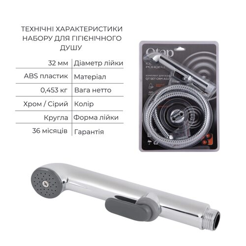 Комплектація | Змішувач (QTNAM6025102NC); набір для гігієнічного душу (QTSETCRMA021); підключення (QTCRMBH130) |