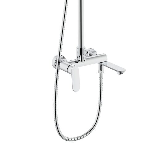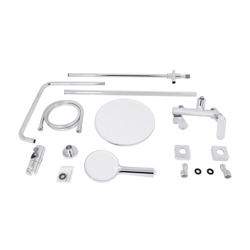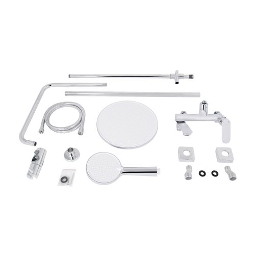 Комплектація | Змішувач, кронштейн для верхнього душу, лійка для верхнього душу, кронштейн для ручного душу, лійка для ручного душу, душовий шланг, душова стійка, кріплення. |