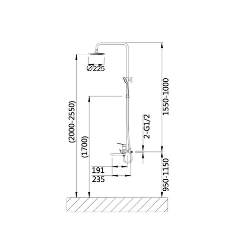 Діаметр лійки, мм Ручний душ 125х125. Верхній душ: 225х225