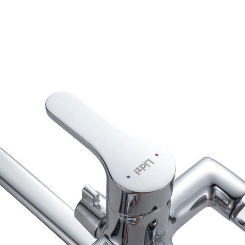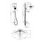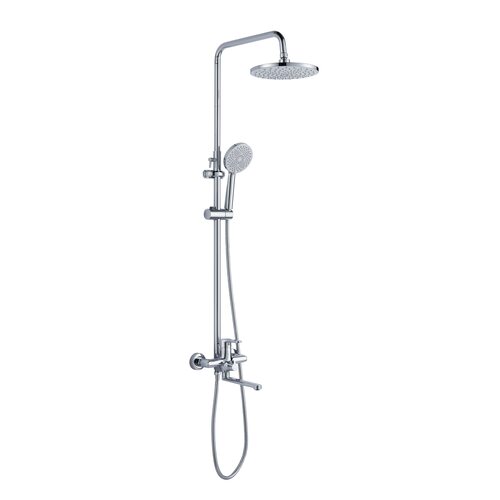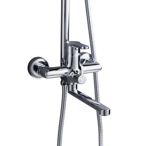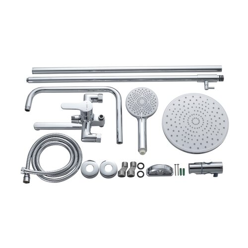Комплектація Змішувач, вилив, душова стійка - 3 секції, верхня лійка, ручна лійка, душовий шланг, декоративні чашки (розетки) - 2 шт, ексцентрики (перехідники) - 2 шт, ущільнювальні прокладки - 2 шт, тримач для ручної лійки, кріплення для стійки.