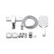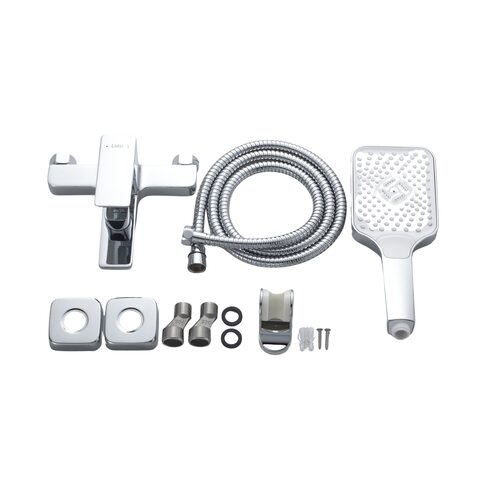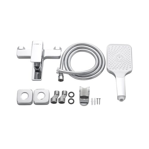 Комплектація | Змішувач, душовий шланг, ручна лійка, декоративні чашки (розетки) – 2 шт, ексцентрики (перехідники) – 2 шт, ущільнювальні прокладки – 2 шт, тримач для душу, кріплення для тримача. |