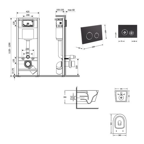 Габаритні розміри виробу (ШхГхВ), мм | Унітаз: 520х360х320. Інсталяція: 1280х425х185. Панель змиву: 220х13х150. |