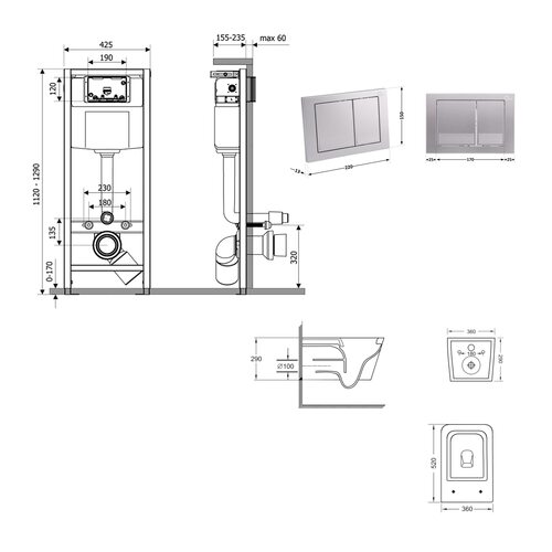 Габаритні розміри виробу (ШхГхВ), мм Унітаз: 520х360х290. Інсталяція: 1280х425х185. Панель змиву: 220х13х150.