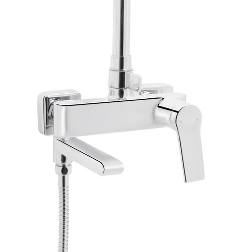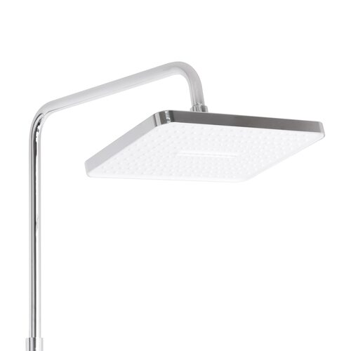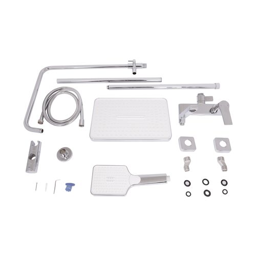 | Комплектація | Настінний змішувач із перемикачем, верхній душ квадратної форми, ручна лійка, душовий шланг, штанга з регульованим тримачем для лійки, кріпильні елементи та ущільнювальні кільця. |