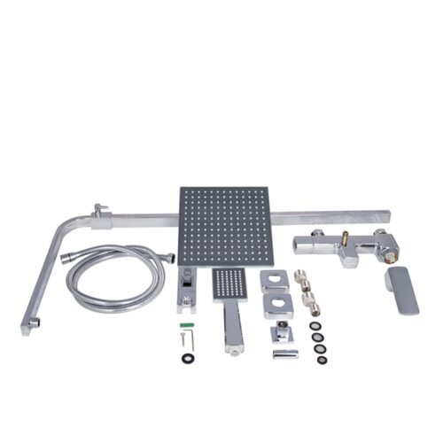 | Комплектація | Настінний змішувач із перемикачем, верхній душ квадратної форми, ручна лійка, душовий шланг, штанга з регульованим тримачем для лійки, кріпильні елементи та ущільнювальні кільця. |