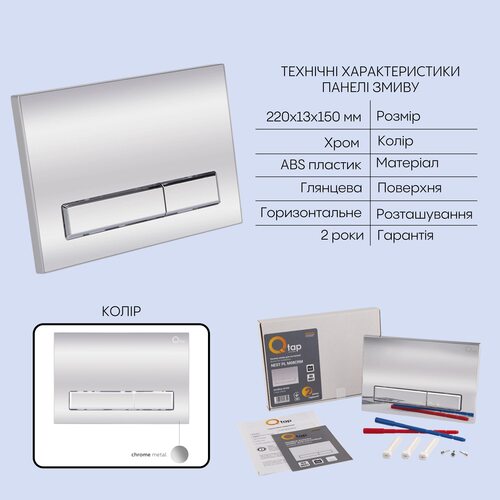 | Матеріал | Метал/ABS пластик – інсталяція; ABS пластик – панель змиву; кераміка – унітаз; дюропласт – сидіння для унітазу |