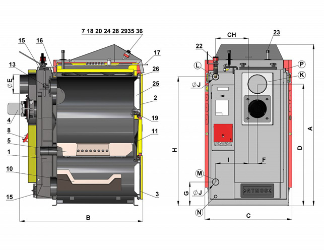 Пиролизные дровяные котлы ATMOS сконструированы для сжигания древесины на принципе генераторной газификации с применением отсасывающего вентилятора, который удаляет из котла продукты сгорания или вгоняет в котел воздух. Корпуса котлов изготовлены из сварных стальных листов толщиной 3-8 мм, сосотоят из насыпной части для топлива, которая оснащена в нижней части жаростойким патрубком с продольным отверстием для прохода продуктов сгорания и газов. Пространство сгорания, находиться под насыпной частью, выложено керамическими блоками. В задней части корпуса котлов находиться вертикальный канал для продуктов сгорания, оснащенный в верхней части клапаном для растапливания. В верхней части канала для продуктов сгорания находиться патрубок для присоединения к дымоходу.