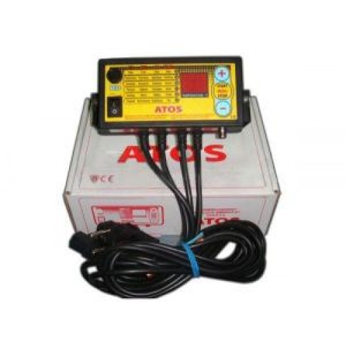 Регулятор ATOС предназначен для управления вентилятором поддува в котлах систем центрального отопления, а также для подключения циркуляционного насоса. Командоконтроллер обладает многими новыми функциями. Он прост в обслуживании и надежен в работе.Модуль "Микропроцессорный регулятор" оптимально использовать с насосом циркуляции теплоносителя и вентилятором принудительной подачи воздуха. Такой комплект позволяет включать и выключать наддув в зависимости от температуры в помещении, при необходимости увеличивать проход воды (теплоносителя) через водяную рубашку котла.От микропроцессора отходит 4 провода, это:1. Кабель питания прибора с вилкой, для подключения в розетку 220В.2. Кабель с разьёмом для подачи напряжения и управления работой вентилятора.3. Кабель для подсоединения к насосу циркуляции теплоносителя.4. Кабель с температерным датчиком на конце, предназначен для постоянного замера температуры теплоносителя. Варианты монтажа температерного датчика:к трубе подачи горячей воды в систему (к стояку);к трубе обратной подачи воды в котёл (к обратке);в водяную рубашку котла через втулку крепления термодатчика.Вы самостоятельно задаёте параметры, например: "Хочу, чтобы батареи были 60-65°C", датчик микропроцессора отслеживает температуру, как только вода остывает ниже 60°C - включается вентилятор, к топливу поступает больше воздуха, усиливается горение и выделяется больше тепла, вода в котле разогревается, как только вода нагреется выше 65°C, микропроцессор выключит вентилятор, котёл перейдёт в рабочий режим горения.Зачем всё это? Пример: Котёл 18кВт без вентилятора потреблял за сутки 4 ведра антрацита (40кг), после переоборудования с помощью модулей вентилятор + микропроцессор, расход топлива, на том же самом объекте, составил 2,5 ведра антрацита (25кг).Экономия - 15кг антрацита в сутки, при цене антрацита около 1грн/кг это 15грн в день, в месяц - 450грн, за отопительный сезон 5,5месяцев - 2 475грн. Неплохо! При этом в комнатах постоянно тёплый воздух, без перепадов "то мёрзнем, то потеем".Вентилятор может быть установлен в момент покупки котла, или в любой момент после установки котла в систему отопления. Для монтажа вентилятора нужно открутить два винта удерживающие шторку на дверце зольника, и вместо шторки, теми же винтами прикрутить рымку с вентилятором. Всё. время монтажа - 2минуты. Монтаж микропроцессора - 10минут. Плюс подключить разъединители и вилку в розетку, итого за 15 минут котёл преобразован.Наддув можно применять:Первичный воздух - вентилятор на дверце зольника, наддув воздуха осуществляется ПОД колосники. Такой способ хорош для растопки, для топлива с коротким пламенем (антрацит, кокс) которое трудно разжечь; для топлива низкого качества (это не секрет, что сейчас могут продать даже землю вперемешку с углём), такое низкокачественное топливо использовать без вентилятора вообще невозможно либо с большими расходами из-за недожёга.Программирование установок менюЧтобы осуществить изменения в меню командоконтроллера следует нажать кнопку МЕНЮ и подержать в течение 3 секунд. На дисплее появится первый параметр. Кнопками +, ― можно выбирать то, что мы хотим изменить. Выбрав соответствующий параметр, следует снова нажать кнопку МЕНЮ. Потом при помощи кнопки + или – уменьшаем или увеличиваем его уровень. Повторным нажатием кнопки МЕНЮ 