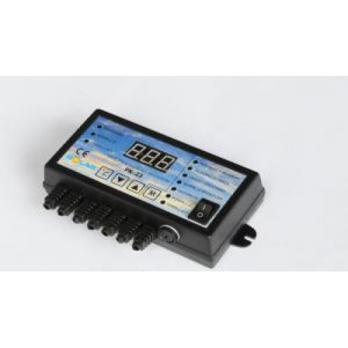 Регулятор температуры Nowosolar РК-23 осуществляет управление вентилятором нагнетания и двумя циркуляционными насосами (насос подачи теплой воды и насос системы центрального отопления). Приоритетной является работа насоса подачи теплой воды. Если температура в бачке теплой воды достигает заданного уровня, включается насос системы центрального отопления. Остальные функции такие, как и у регулятора РК-22. Управляет работой нагнетательного вентилятора и насоса центрального отопления. Имеет функцию продувки – когда температура выше указаной вентилятор периодически выключается, через время указаное пользователем.Время работы и перерыв можна сменить в любой момент. Контроллер имеет 8 – уровней силы нагнетания.Контроллер изоготовляется в нескольких вариантах, в зависимости от типа котла. Программа рассчитывается индивидуально под каждого заказчика; длина проводов подбирается таким образом, что бы монтаж был легким и быстрым.