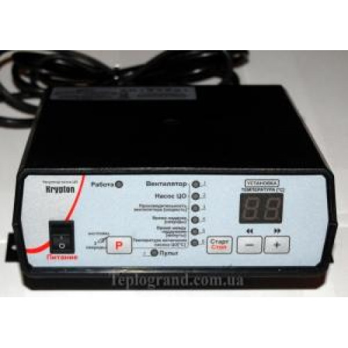 Автоматика для котла Krypton служит для регулировки температуры теплоносителя в системе центрального отопления за счет плавного изменения оборотов нагнетательного вентилятора, производит ликвидацию газов, которые скапливаются в камере сгорания, а также способствует защите от кипения воды.Она, также, управляет работой циркуляционного насоса.Автоматика для котла Криптон доступна в двух вариантах: 250 Вт и 550 Вт (усиленная модель). В усиленной модели можно подключить два нагнетательных вентилятора и имеется аварийный термостат.Основные функции автоматики Kryptonплавная регулировка оборотов вентилятора;изменение скорости вращения вентилятора (доступно 50 скоростей);контроль и экономия топлива;функция "антизамерзание" - при температуре теплоносителя в системе ниже 5 °C, автоматика для котла Krypton включает циркуляционный насос.функция "анти-стоп" - каждый 14 день (после отопительного сезона), на 1 минуту включается насос - таким образом предотвращается его выход из строя в летний период. Функция работает при включенном контроллере;сохранение настроек при аварийном отключении (исчезновении электропитания);регулятор имеет возможность вернуться к заводским настройкам. Эта функция полезна при неправильной настройке неквалифицированными монтажниками;аварийный автоматический термостат (в усиленной версии), который защищает от перегрева;программируемые параметры пользователем;может управлять любыми нагнетательными вентиляторами, которые представлены на рынке Украины;может подключаться к пульту дистанционного управления или комнатному термостату Prond Pilot R.Блок управления следует монтировать в месте, где он не будет нагреваться свыше 40 °C. Датчик температуры следует крепить в месте, где температура наиболее соответствует температуре воды в котле.