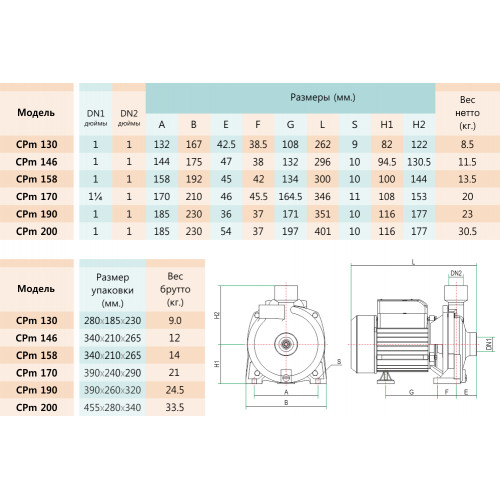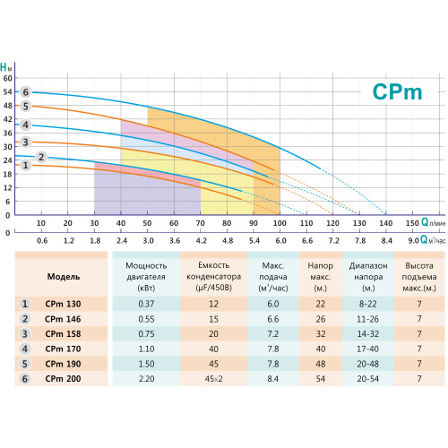 Отличительными особенностями центробежных насосов CPm является высокая эффективность, высокий напор при малой и средней производительности, стабильные параметры, легкий монтаж и обслуживание.