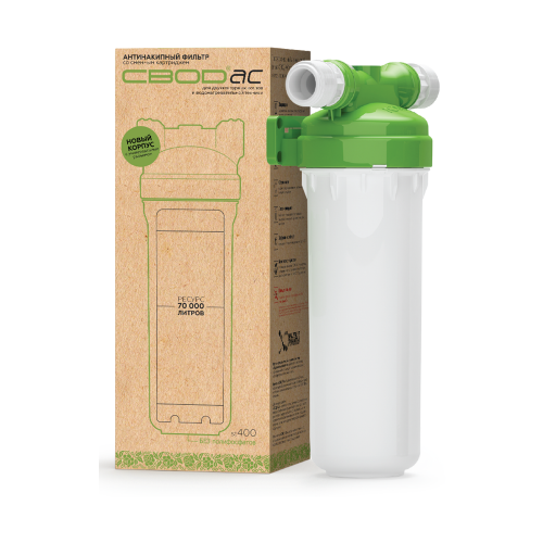 Антинакипный фильтр для двухконтурных котлов и водонагревательной техники со сменным картриджем СВОД-АС. Наполнитель СВОД-АС давно зарекомендовал себя, как надежная защита, не имеющая аналогов по широте и спектру применения в обеспечении безнакипного режима работы водонагревательного оборудования. Мы расширили линейку и произвели для своих картриджей колбы нового поколения с подключением "SMART - коннект". Для монтажа колб предусмотрены отверстия для крепления на кронштейн с обеих сторон крышки (это позволяет установить фильтр в любом удобном для Вас месте со входом воды, как с левой, так и с правой стороны). Технические характеристики: Размер 10 дюймов Ресурс фильтра - 70 000 литров Температура обрабатываемой воды: +5 ... +40 °С Рабочая температура нагреваемой воды: +5 ... +105 °С Максимальное давление воды - до 0,6 МПа (6 атм.) Срок эксплуатации (картриджа) - 1 год Срок годности (картриджа) - 3 года Комплектация: Корпус Картридж "СВОД-АС" s400 Кронштейн Подключение ½ или ¾ (см. на упаковке или уточнять при заказе) Паспорт и инструкция эксплуатации