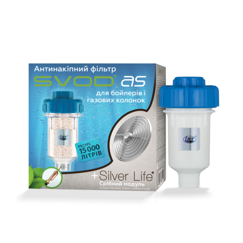 Наверняка, вы уже успели оценить все достоинства антинакипного фильтра "SVOD-AS"​, наполнитель которого — волшебные гранулы — обладает уникальными свойствами: препятствует образованию накипи, удаляет ранее образовавшиеся отложения. Но еще более уникальным наш новый фильтр "Silver SVOD-AS"​ делает посеребрённый модуль, основной функцией которого является уничтожение бактерий, вирусов, грибков и др. патогенов в воде. Другими словами, проходя через фильтр "Silver SVOD-AS", вода насыщается серебром — происходит обеззараживание проточной воды и застойных зон. При этом химический состав воды сохраняется в соответствии с ГОСТ "Вода питьевая". Рекомендуем устанавливать для защиты от накипи в случаях редкого пользования оборудования (в загородных домах, на даче). Антинакипный фильтр "Silver SVOD-AS"​ для бойлеров и газовых колонок: защищает ТЭН от образования накипи и других отложений; оберегает резиновые уплотнители от преждевременного износа; продлевает срок эксплуатации техники; уничтожает бактерии, вирусы, грибки в застойных зонах фильтра и проточной воде; уменьшает активность хлора и сероводорода, снижает содержание тяжелых металлов и взвесей; экономит до 20% электроэнергии; исключает необходимость использования других антинакипных средств; легко монтируется без применения специального инструмента; ​безопасен для здоровья, гипоаллергенен. Технические харктеристики: Присоединительный размер: 3/4" Производительность фильтра: 1,5 — 3 м3/час Объем наполнителя: 100 мл ± 3% Высота: 135 мм Диаметр: 68 мм Максимальное давление воды - до 0,6 МПа (6 атм.) Температура обрабатываемой воды: +5 ... +40 °С Рабочая температура нагреваемой воды: +5 ... +105 °С