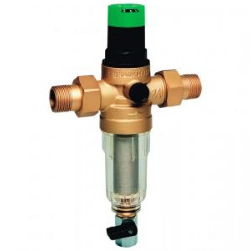 Фильтры FK06 представляют собой комбинацию промывного фильтра с клапаном понижения давления для непрерывного водоснабжения фильтрованной водой. Они предотвращают проникновение инородных тел, таких как частицы ржавчины, волокон пеньки или песчинок. Инородные частицы, собранные внутри колбы фильтра, могут быть легко удалены посредством промывки. Клапан понижения давления предупреждает защиту от избыточного давления и понижает расход воды. Каждый из перечисленных элементов в отдельности удовлетворяет требованиям действующи норм DIN/DVGW. Особенности и характеристики индивидуальных элементов также распространяются на всё комбинированное устройство. Небольшие размеры позволяют установить комбинированный фильтр в местах с ограниченным пространством.Особенности фильтра Honeywell miniplus FK06:Протестирован по требованиям DIN/DVGWПростая сборкаПростая настройка выходного давленияНастройка читается на настроечной шкалеНастроечная пружина не вступает в контакт с водойКартридж клапана может полностью менятьсяПодача фильтрованной воды не прекращается в процессе промывкиКолебания входного давления не оказывают влияния на выходное давлениеСетка и колба фильтра могут менятьсяСбалансированное седло клапанаМожет оснащаться входным обратным клапаномПроверенная и надёжная конструкцияСоответствует требованиям KTWКонструкция фильтра с редуктором давления воды Honeywell FK06 miniplus:Комбинированный фильтр miniplus FK06 состоит из:Корпуса с отверстиями G 1/4" под манометр с обеих сторонРезьбового соединения (Версия A)Картридж клапана с диафрагмой и седлом клапанаПружинного стакана со шкалой и ручкой настройкиНастроечной пружиныСетки фильтра тонкой очистки с колбойШарового клапанаПоставляется без манометра.Материалы фильтра с регулятором давления FK06 HoneywellКорпус из латуни, устойчивой к вымыванию цинкаФитинги из латуниКартридж клапана из высококачественного синтетического материалаПружинный стакан со шкалой и ручкой настройки из высококачественного синтетического материалаПружина из пружинной сталиСетка фильтра из нержавеющей сталиКолба фильтра из ударопрочного синтетического материала или латуни, устойчивой к вымыванию цинкаДиафрагма из армированного NBRТехнические данные комбинированного фильтра для воды FK06 Honeywell:Среда применения: водаМонтажное положение: горизонтальное, колбой фильтра внизРабочее давление: максимум 16 барДиапазон настройки выходного давления: 1,5 - 6,0 барРабочая температура: максимум 40°С с прозрачной колбой и максимум 70°С с колбой из латуниПринцип работы комбинированного фильтра с регулятором давления Honeywell FK06Комбинированный фильтр FK06 объединяет в себе клапан понижения давления D06F и промывной фильтр тонкой очистки FF06. В процессе нормальной работы вода проходит через ячейки фильтра FF06 на выход. Для промывки фильтра от частей грязи нужно открыть шаровый кран. В процессе промывки подача фильтрованной воды не прекращается. Встроенный регулятор давления воды D06F работает по принципу уравнивания усилий. Это означает, что сила диафрагмы действует навстречу силе упругости пружины. Входное давление на влияет на открытие или закрытие клапана, поэтому колебания входного давления не оказывают влияние на выходное давление.Пример монтажа: